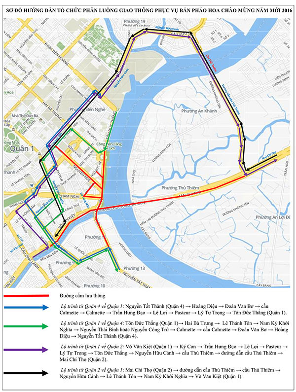 Ngoài ra, từ 20 giờ ngày 31/12 đến 00 giờ 20 ngày 1/1/2016, TPHCM cấm tất cả các loại phương tiện lưu thông vào các tuyến đường sau (sơ đồ chi tiết đính kèm):
