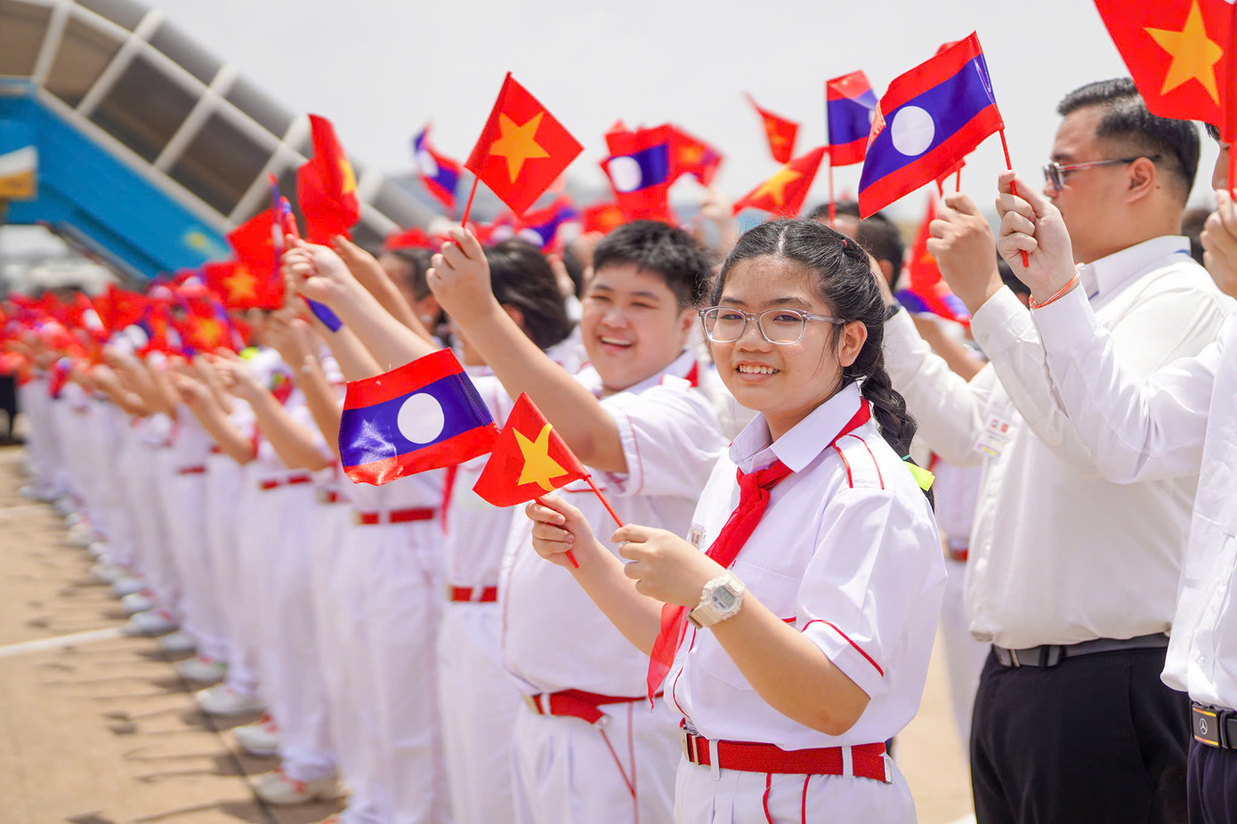 Tại sân bay quốc tế Tân Sơn Nhất, các bạn học sinh, sinh viên, đoàn viên thanh niên, thiếu nhi Việt Nam và Lào vẫy cờ hai nước chào mừng đoàn đại biểu cấp cao Đảng, Nhà nước Lào trong không khí hân hoan.