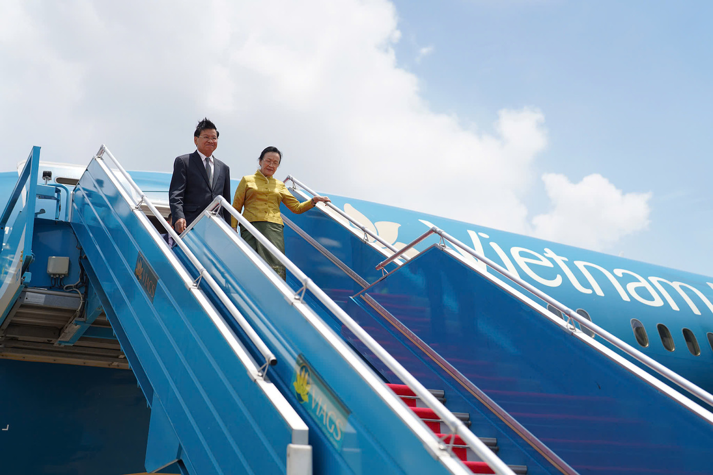 | Tổng Bí thư, Chủ tịch nước Lào Thongloun Sisoulith và Phu nhân bước xuống từ máy bay, khởi đầu chuyến thăm TPHCM. Ảnh: Phạm Nguyễn |