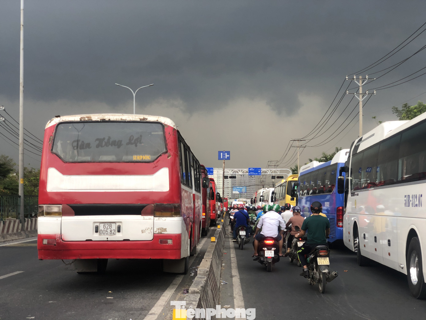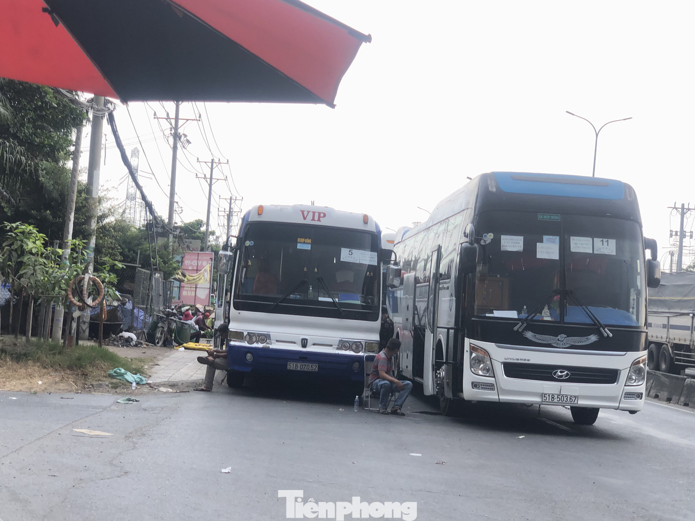 Tầm 16h hàng ngày, hàng chục chiếc xe đưa rước công nhân Pouyuen xếp hàng dài cả cây số, chen vào cả làn đường xe máy trên Quốc lộ 1, khiến con đường thường xuyên ùn tắc ngay trong những ngày "cách ly toàn xã hội" do COVID-19