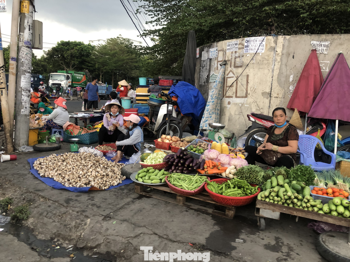 Chợ tự phát dành hết cả lối của người đi bộ. Dường như khuyến cáo "hạn chế ra đường" để phòng ngừa lây lan COVID-19 bị phớt lờ nơi đây