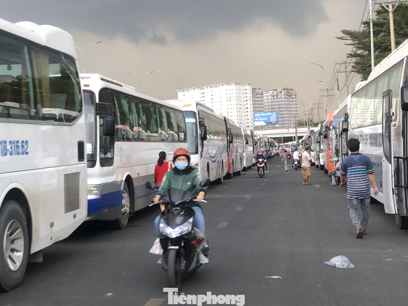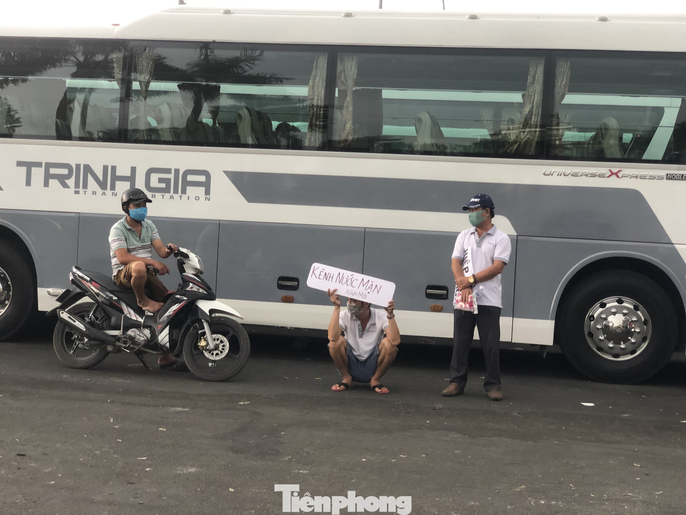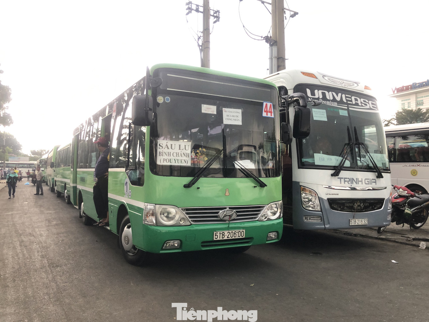 Tài xế chờ sẵn để đón khách. "Đủ số người là chạy, nhanh để tránh kẹt xe. Chúng tôi đều thực hiện đeo khẩu trang đầy đủ" - một nhà xe cho biết.