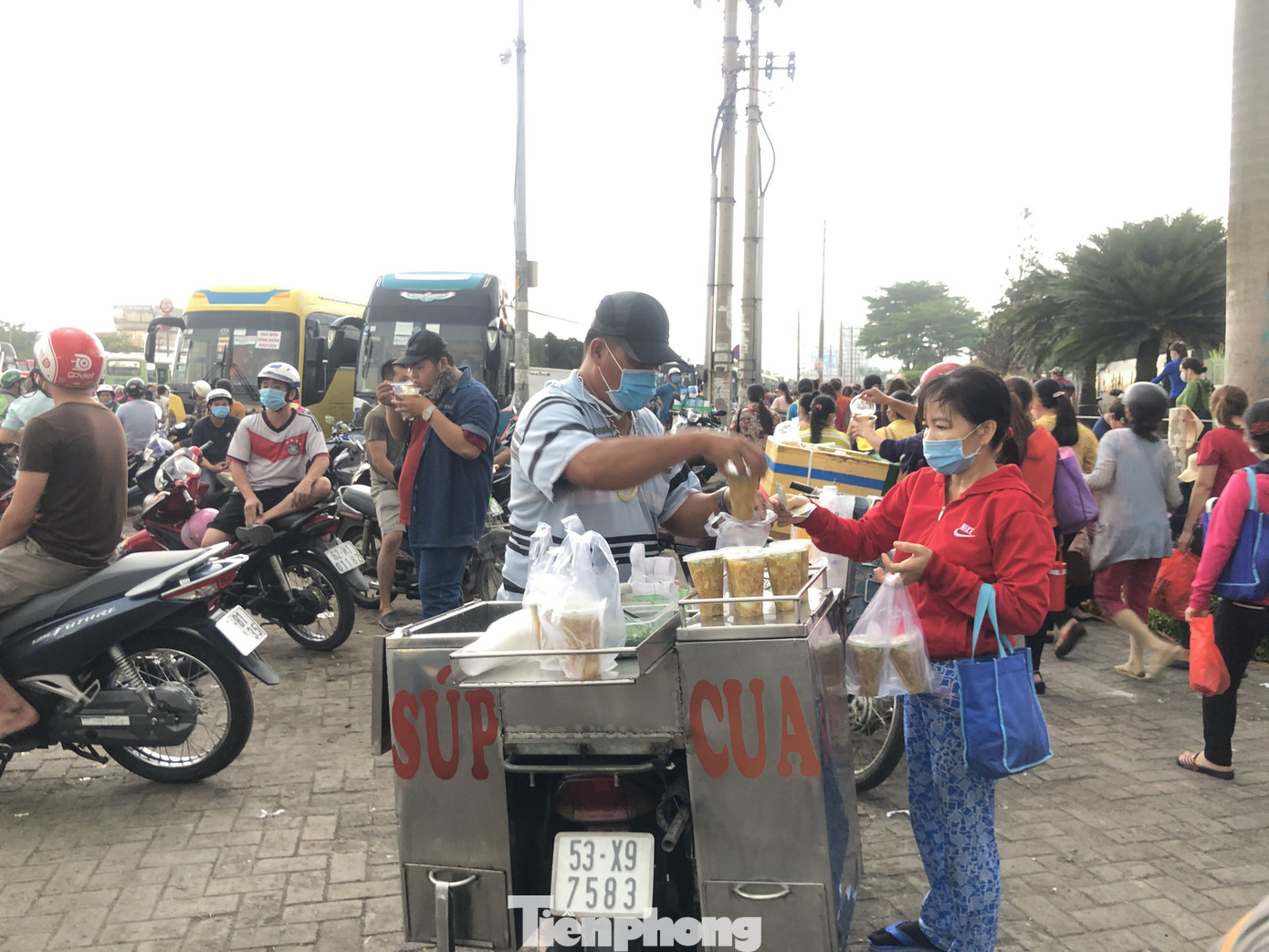 Chợ tự phát trước công ty Pouyuen cũng hoạt động nhộn nhịp, người dân vô tư ăn uống tại chỗ.