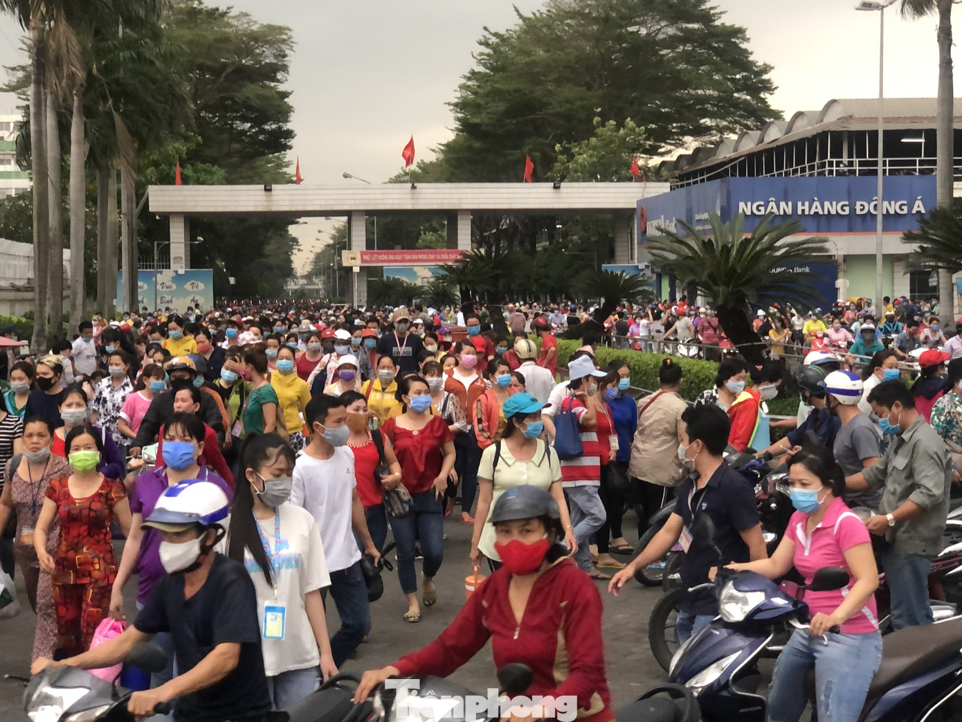 Đúng giờ tan ca, dòng người túa ra từ cổng công ty như ong vỡ tổ. Dù ai cũng đeo khẩu trang nhưng đứng gần nhau sát rịt. Pouyuen có tới 72.000 công nhân, trong đó nhiều công từ các tỉnh lân cận như Long An, Bến Tre... lên làm việc