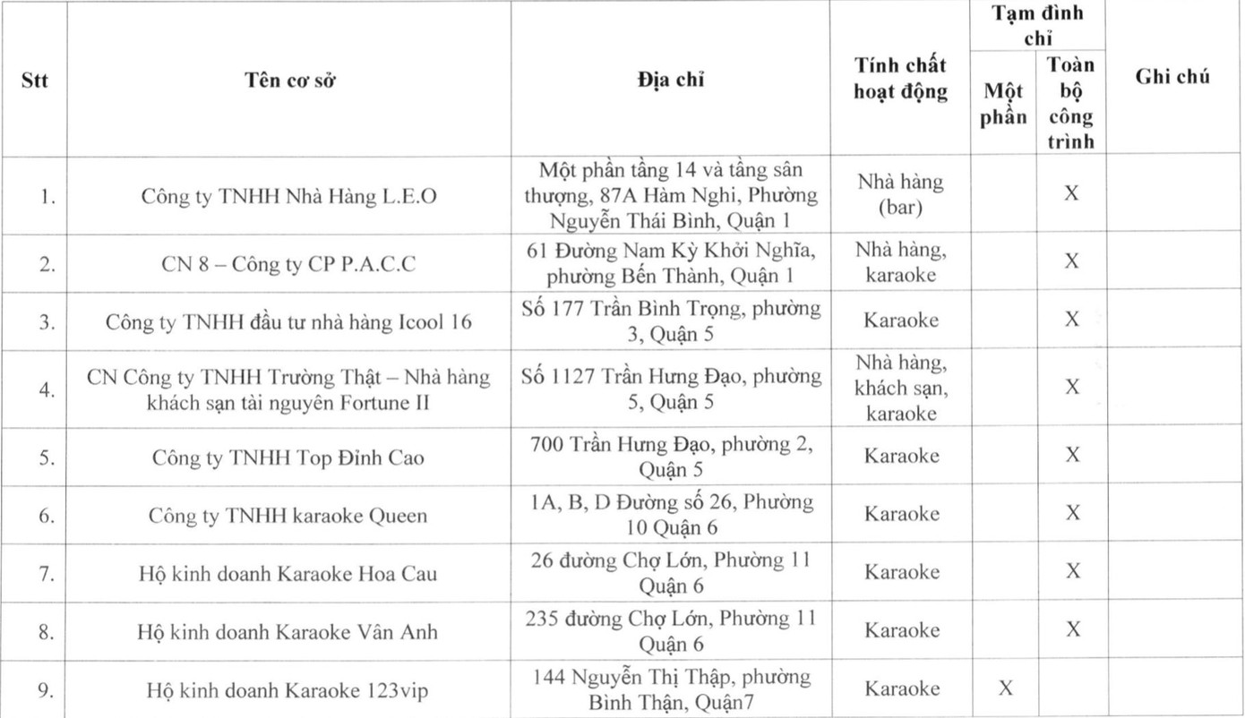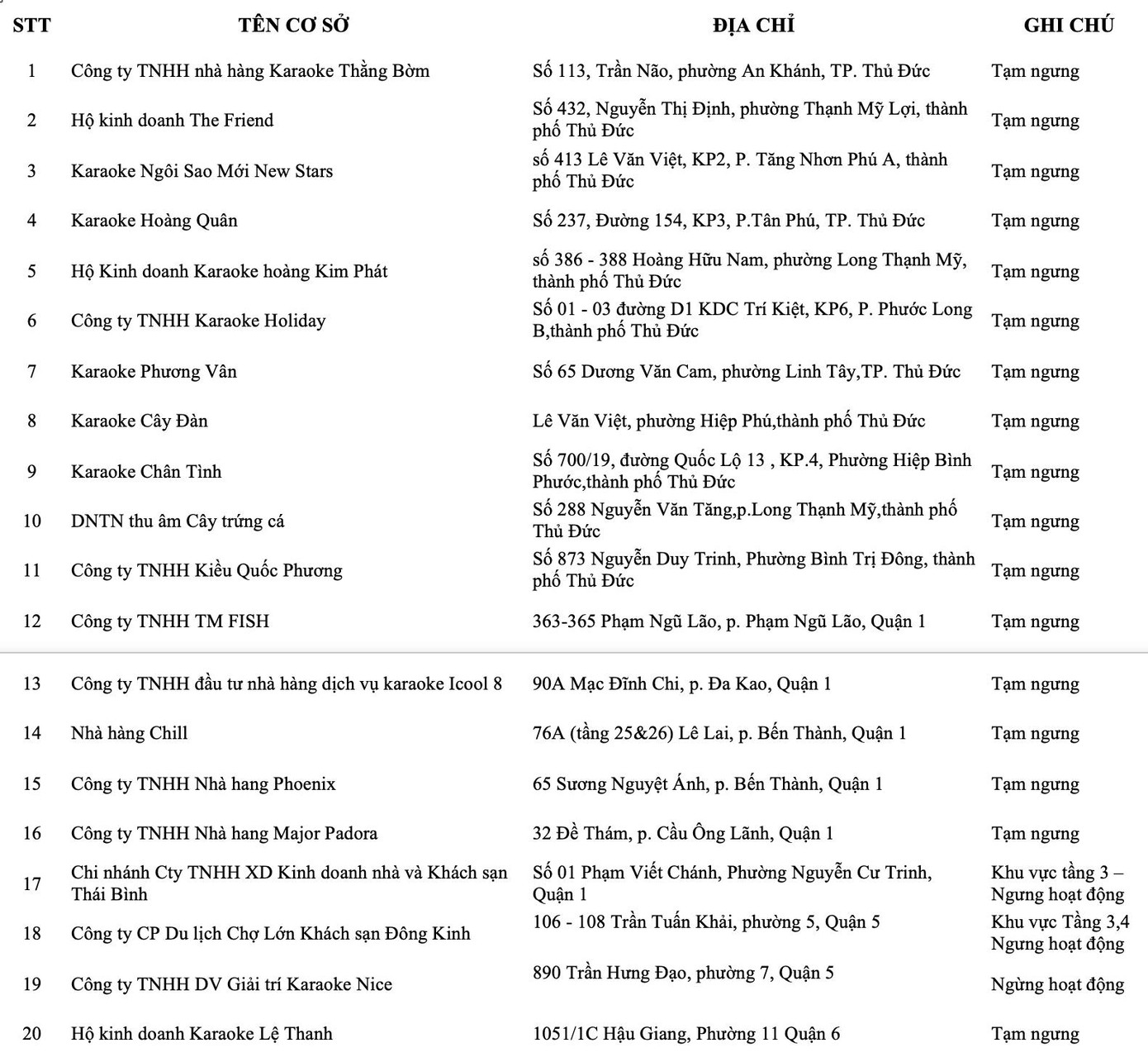 Danh sách 83 cơ sở có tính chất hoạt động tương tự dịch vụ karaoke, vũ trường, quán bar trên địa bàn TPHCM xin tạm ngưng hoạt động.
