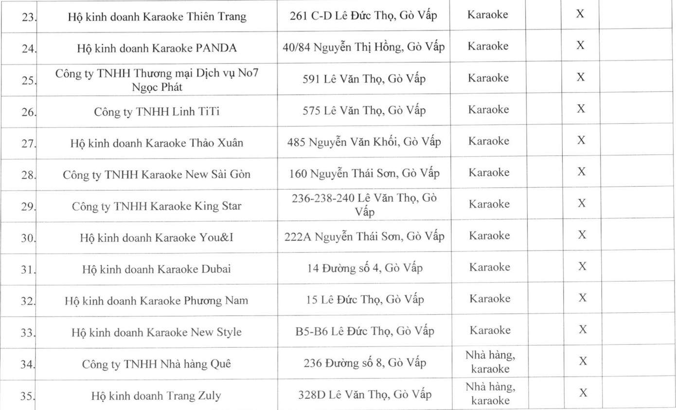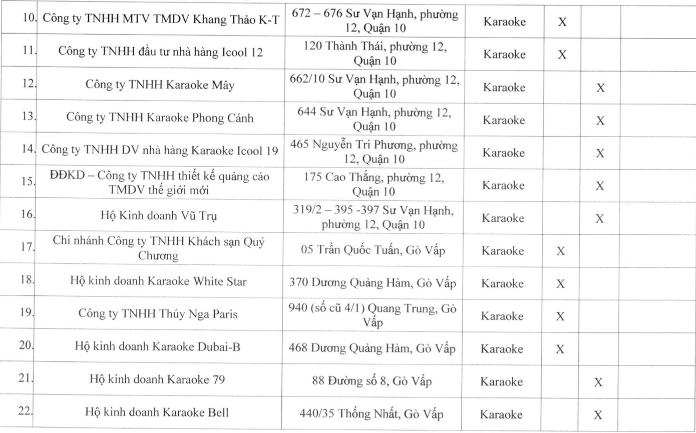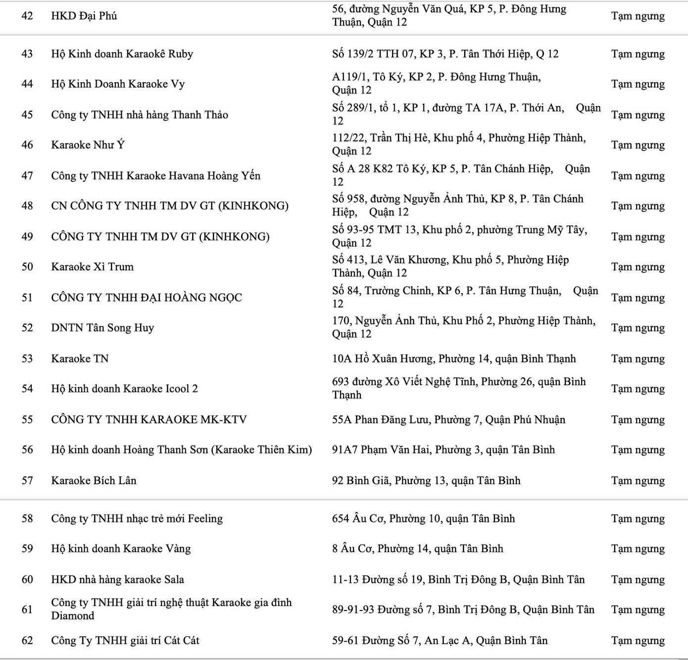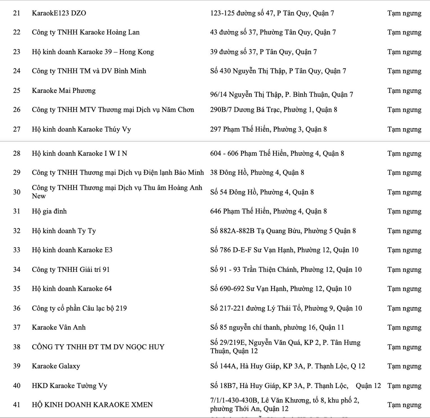 Danh sách 50 cơ sở kinh doanh dịch vụ karaoke, vũ trường, quán bar trên địa bàn TPHCM bị tạm đình chỉ hoạt động.