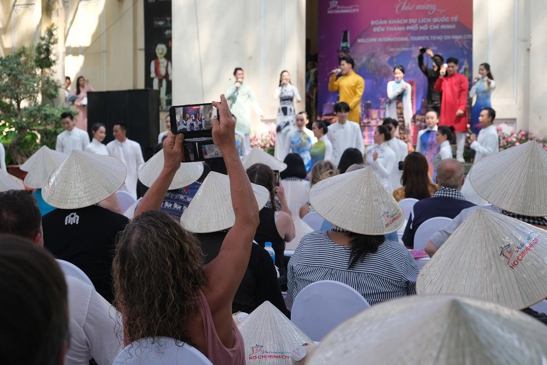 | Đoàn du khách quốc tế hào hứng khi được thưởng thức tiết mục văn nghệ và màn trình diễn áo dài đặc sắc. |