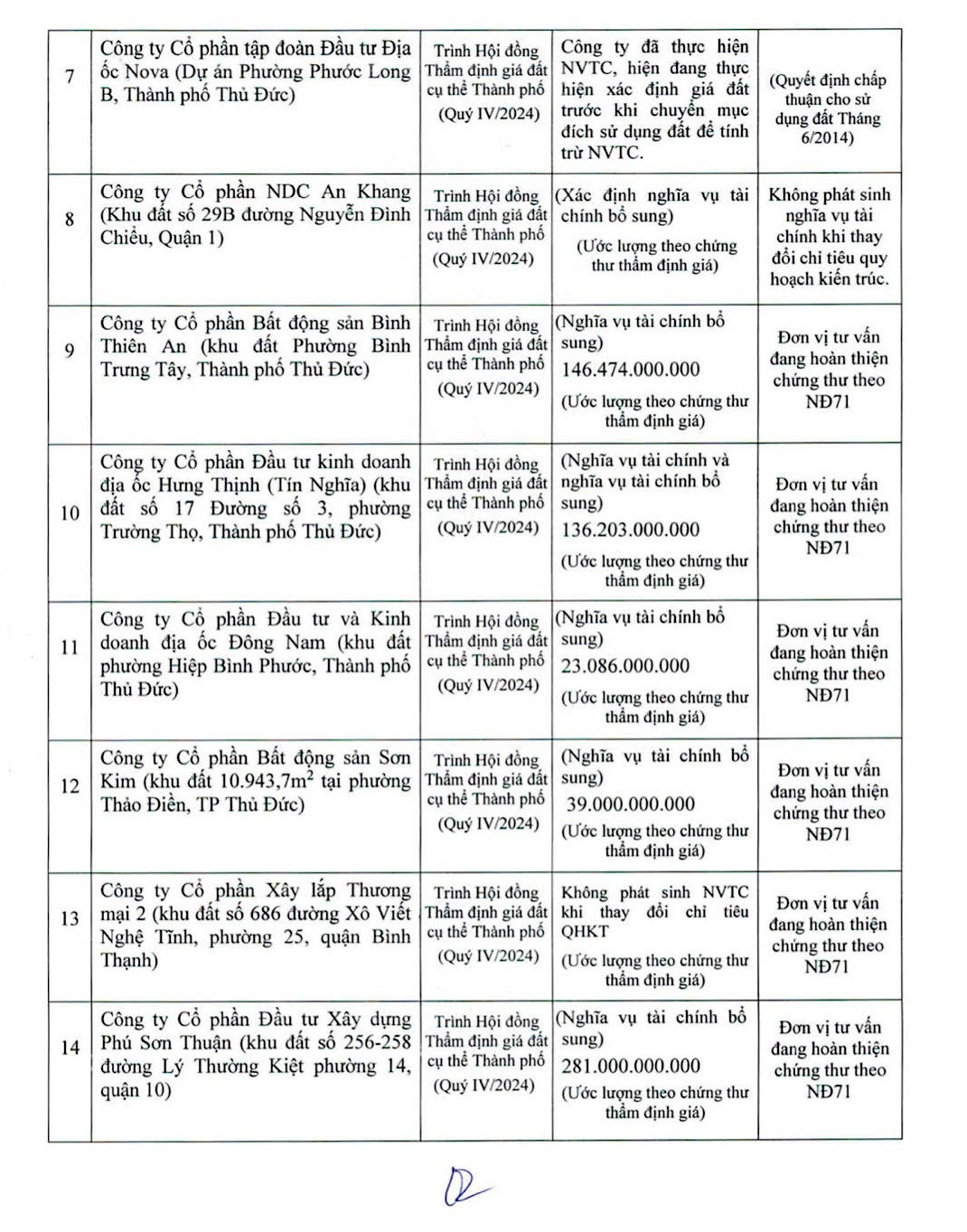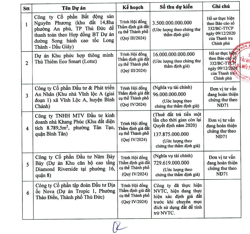 Ngoài ra còn có Công ty TNHH Bất động sản N.T.N Trung Thủy với khu đất 230 Nguyễn Trãi (quận 1), dự kiến thu hơn 3.286 tỷ đồng. Công ty CP Đầu tư Năm Bảy Bảy với dự án Khu căn hộ cao tầng Diamond Riverside (quận 8), dự kiến thu hơn 729 tỷ đồng. Công ty CP Xây dựng và phát triển nhà Hoàng Anh với khu đất phường Tân Hưng (quận 7), dự kiến thu 623 tỷ đồng. Công ty CP Kinh doanh và Phát triển Bất động sản Đông Sài Gòn với khu đất số 52/1 đường 400 (phường Tân Phú, quận 9) cũng cần nộp hơn 316 tỷ đồng…