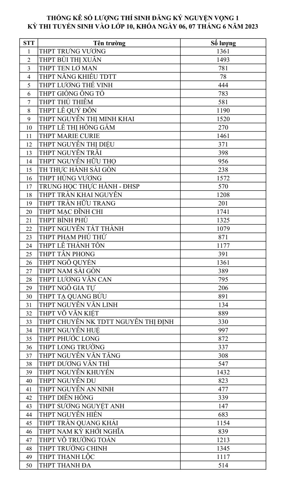 Đây là số thí sinh đăng ký nguyện vọng 1 vào lớp 10 công lập 2023- 2024. Số liệu này do Sở GD&ĐT TPHCM công bố chiều 12/5.