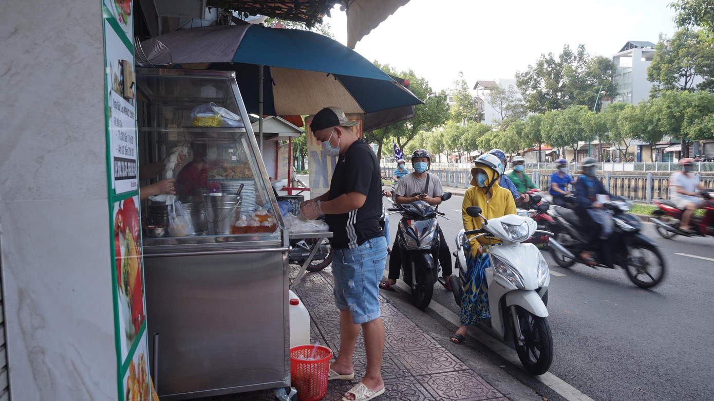 | Người dân dần thích nghi với việc mua đồ ăn, thức uống mang về, không tập trung ngồi tại quán để phòng dịch COVID-19. |