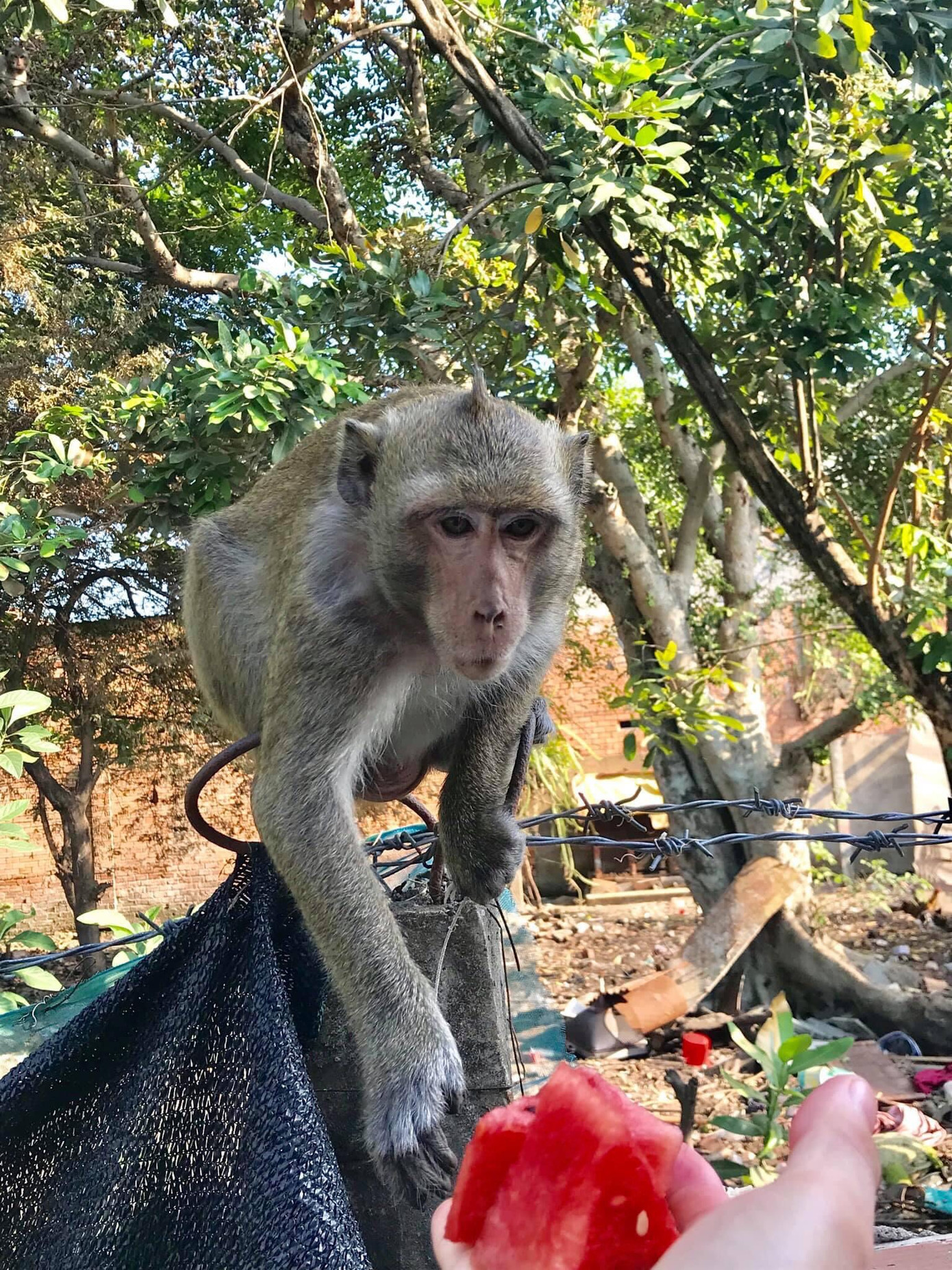 Bà Nguyễn Thị Cúc, nhà thuộc Khu phố 6 (sát nơi đàn khỉ trú ngụ) cho biết, đàn khỉ có khoảng vài chục con, thường xuất hiện theo từng đợt, từng tốp có khi 5-6 con, thường xuyên đu trên dây điện, hái cây trái (như mít, nhãn...) của nhà người dân. “Dù chưa cắn ai nhưng bọn khỉ nó phá dữ lắm, rau màu, cây trồng nó nhổ hết trơn… Nhiều lúc nó hù người dân chạy suốt”, bà Cúc kể.
