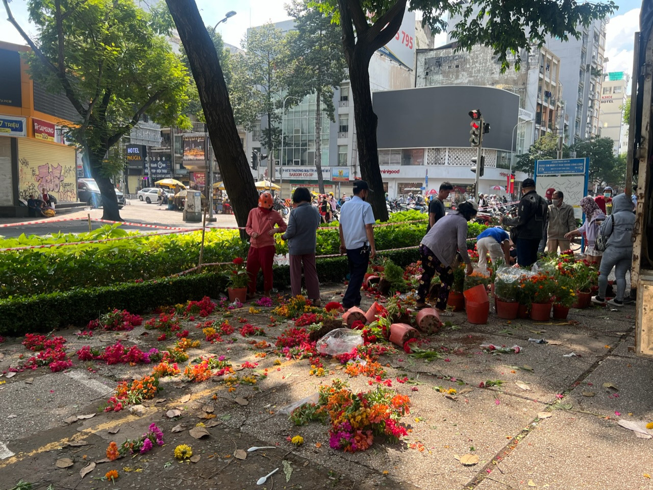 Hoa bị phá bỏ, tiểu thương chỉ lấy lại chậu. Hoa nằm ngổn ngang trên mặt đất.