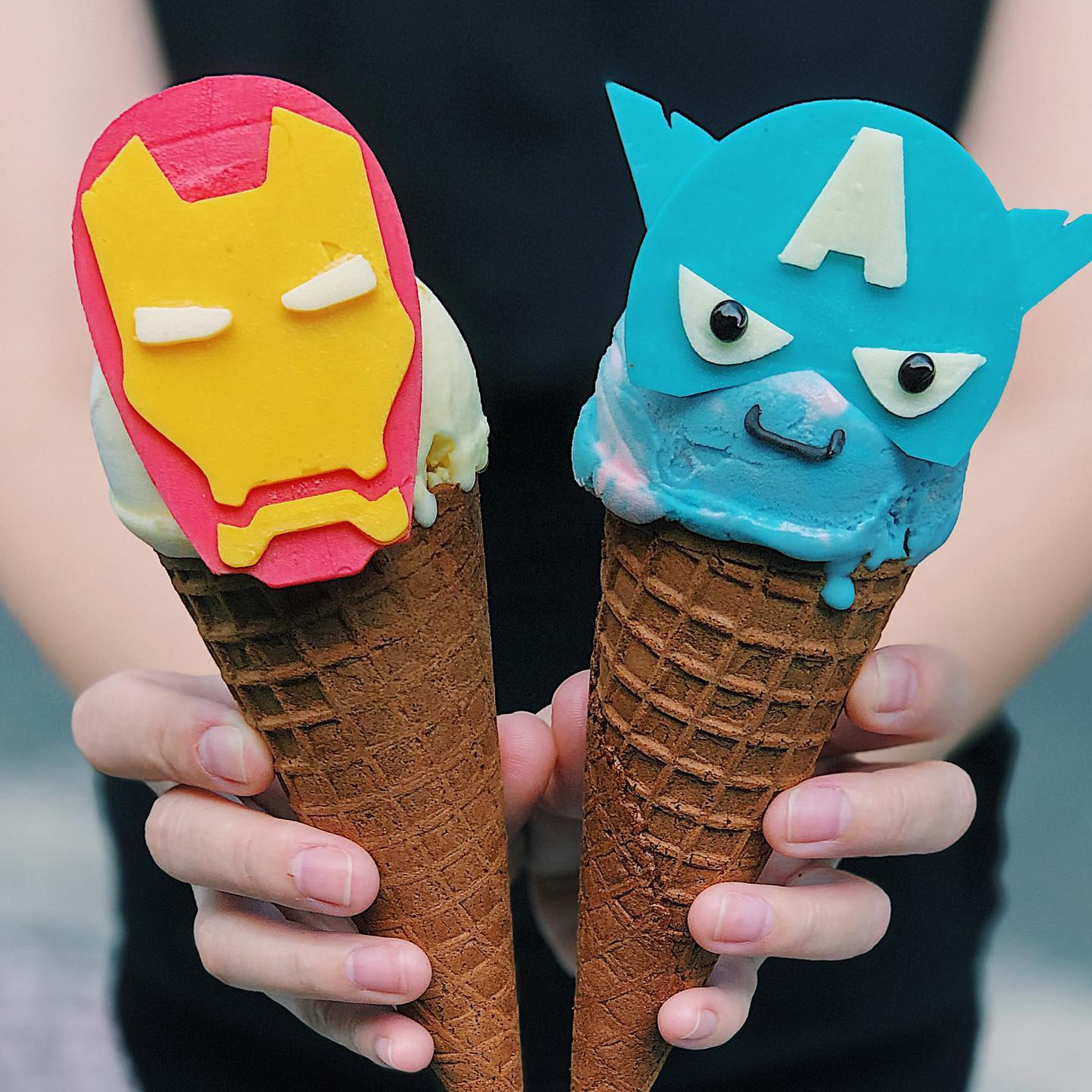 Kem Ý chuẩn vị, tươi ngon kết hợp với khâu design thủ công trong từng giai đoạn để cho ra một cây kem ốc quế hay ly kem Iron Man - Captain America - Thor - Hulk - Spider Man quá xá đẹp. Fan của Marvel chắc chắn sẽ xỉu nhẹ cho mà xem!