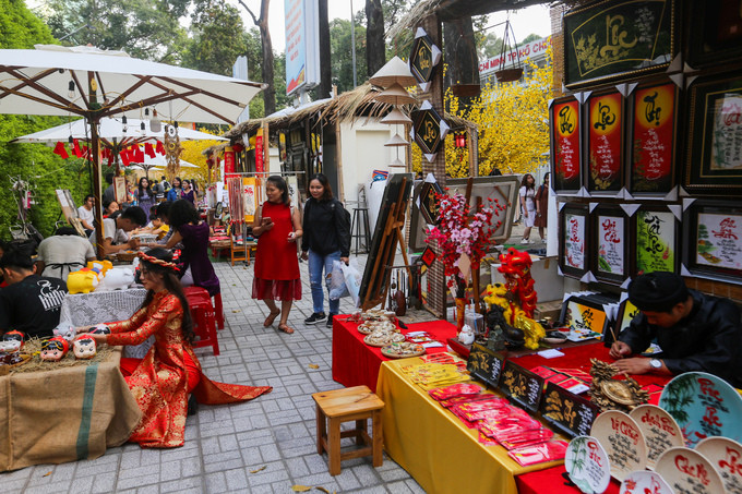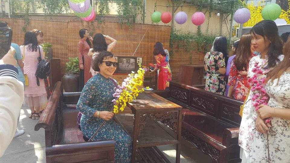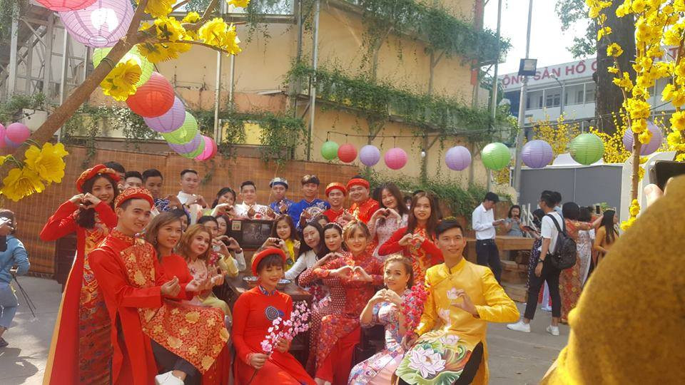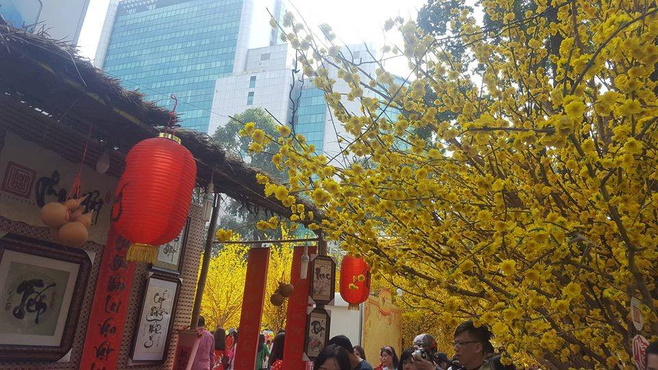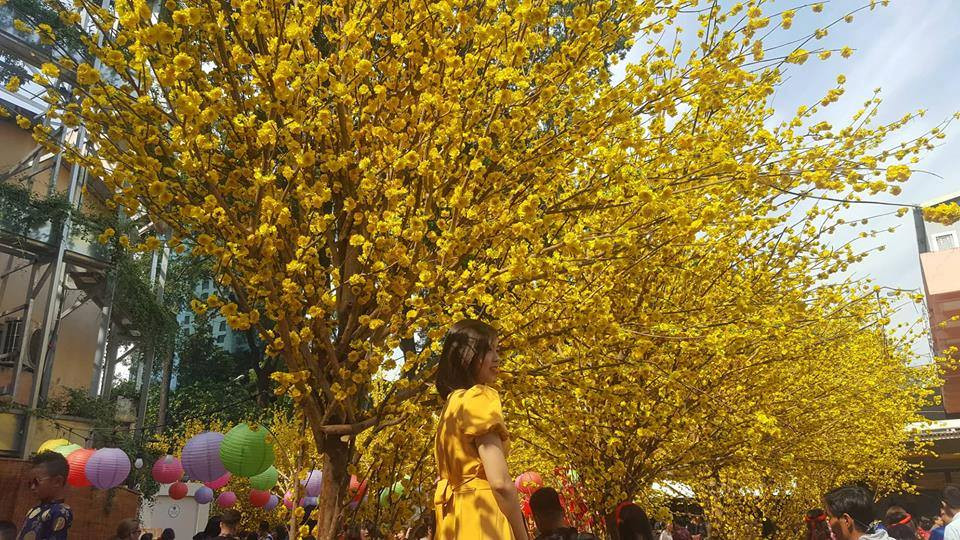 Hoa mai được trang trí vàng rực nguyên cả con phố. Câu đối đỏ treo rực rỡ báo hiệu xuân sang. Những tà áo dài với hoạ tiết đỏ nổi bật hoặc hoạ tiết vintage sẽ khiến bạn không thể rời mắt. À, bật mí một chút: teen Sài thành rất mê mặc áo dài chụp ảnh Tết đó nha!