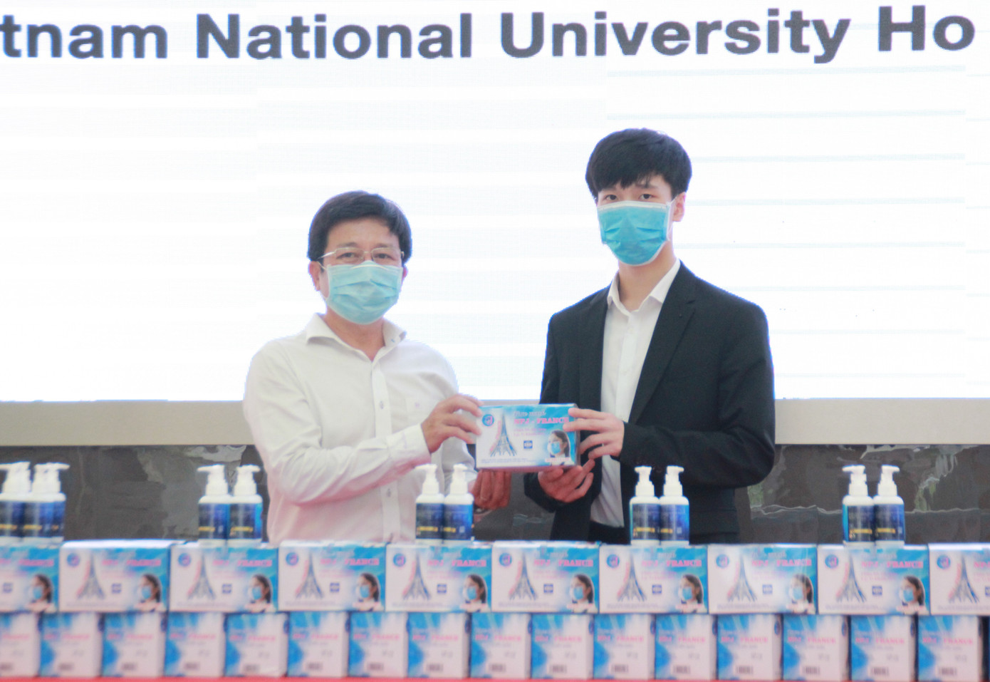 Ông Jesse Choi, Giám đốc Sunwah Việt Nam (bìa phải) tặng trang thiết bị y tế cho đại diện ĐHQG TPHCM