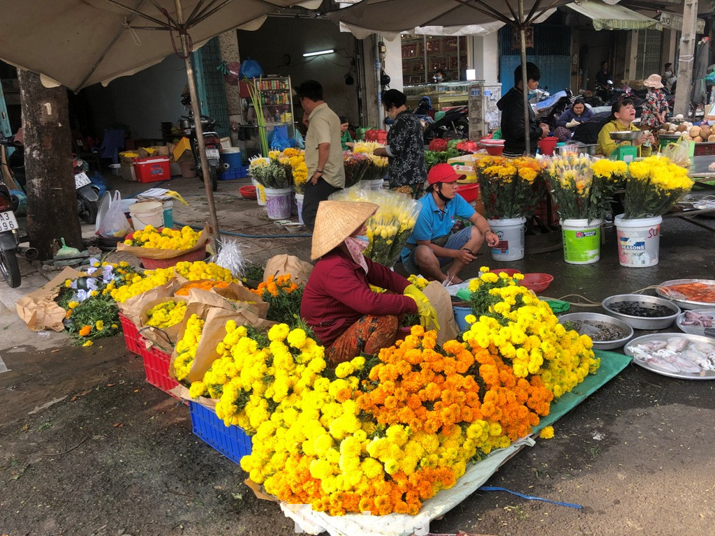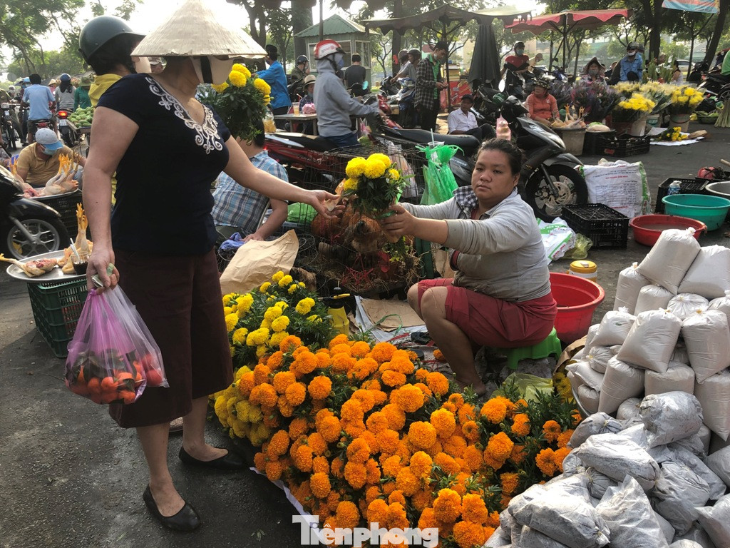 Bông vạn thọ, cúc... giá từ 5.000-10.000 đồng/cây nhưng không ai mua, tiểu thương mỏi mắt chờ khách.
