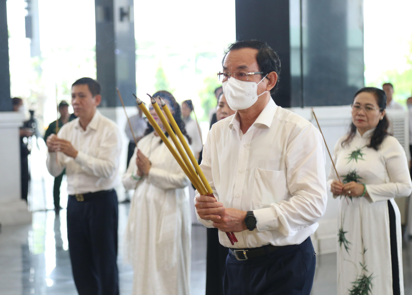 | Lãnh đạo TPHCM thắp nén tâm nhang tưởng nhớ đồng bào đã mất trong đại dịch. |