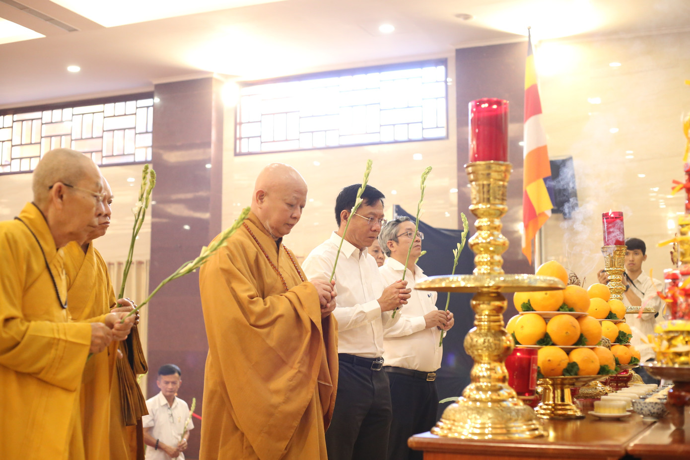 | Chư tôn đức giáo phẩm Ban Trị sự GHPGVN TPHCM cùng lãnh đạo các ban ngành thành phố đặt hoa tưởng niệm các nạn nhân TNGT. |