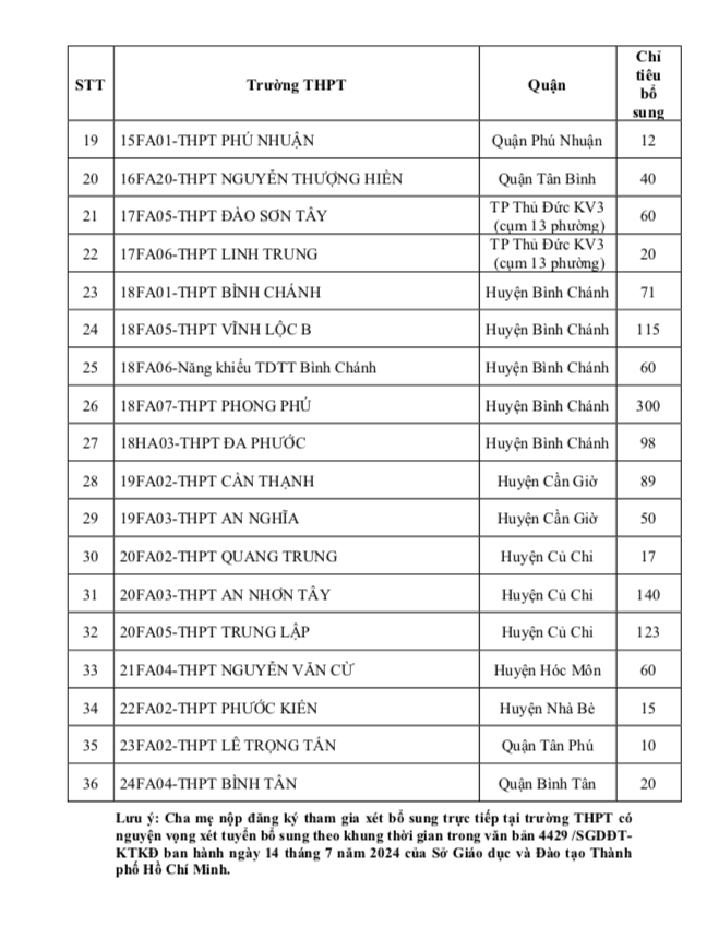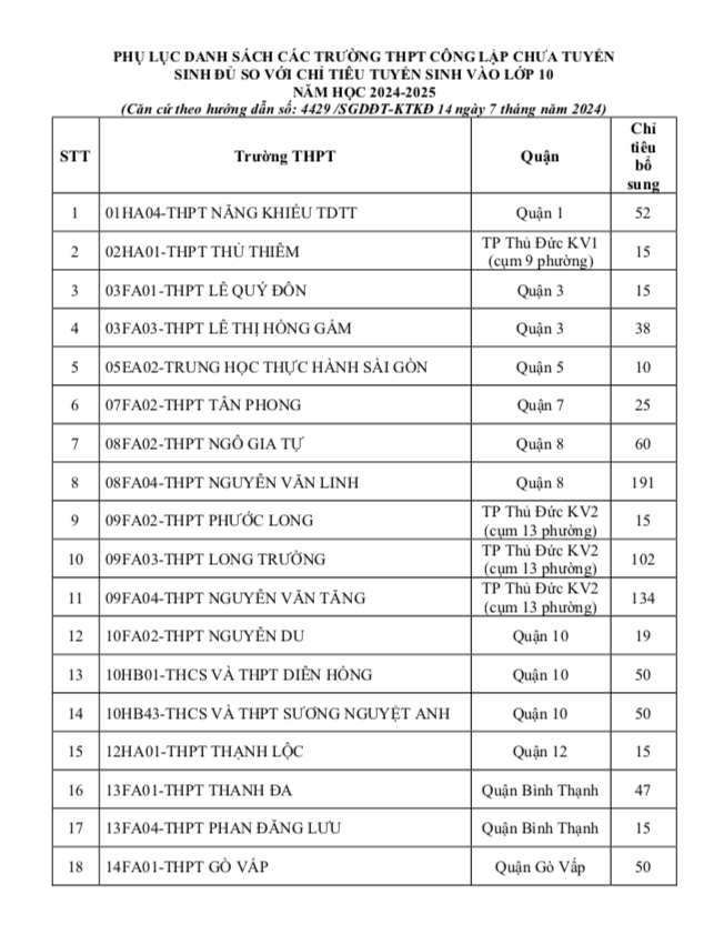 Đối tượng là học sinh đã tham dự kỳ thi tuyển sinh vào lớp 10 năm học 2024 - 2025 tại TPHCM. Mỗi học sinh chỉ được đăng ký tuyển bổ sung vào 1 trường THPT công lập chưa tuyển sinh đủ chỉ tiêu được giao và không được thay đổi trường khi đã nộp hồ sơ đăng ký tuyển sinh bổ sung.
