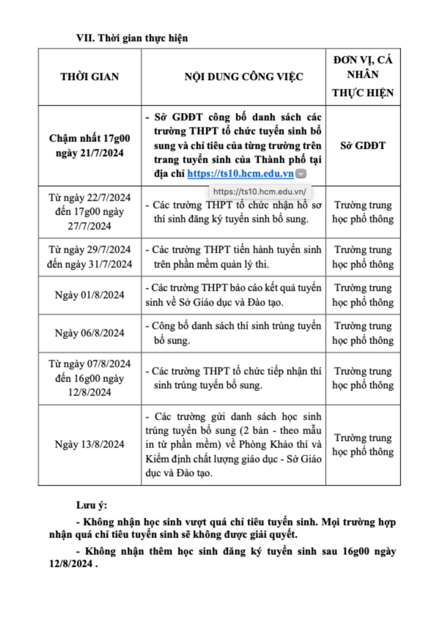 Chi tiết thời gian thực hiện tuyển bổ sung lớp 10 như sau: