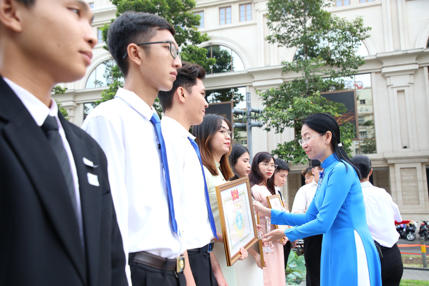 | Trưởng ban Dân vận Thành ủy TPHCM Nguyễn Mạnh Cường và Bí thư Thành Đoàn TPHCM Phan Thị Thanh Phương tuyên dương các sinh viên tiêu biểu. |