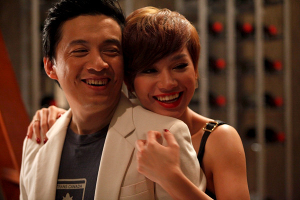Sau pha thân mật, Trà My và Lam Trường bật cười vui vẻ. Ngoài đời, hai người là anh em đồng nghiệp thân thiết.