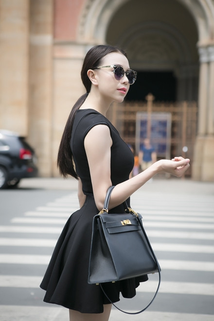 Kết hợp với kính xanh dương, Trà Hằng toát lên vẻ thanh lịch thời thượng cùng túi xách sành điệu.