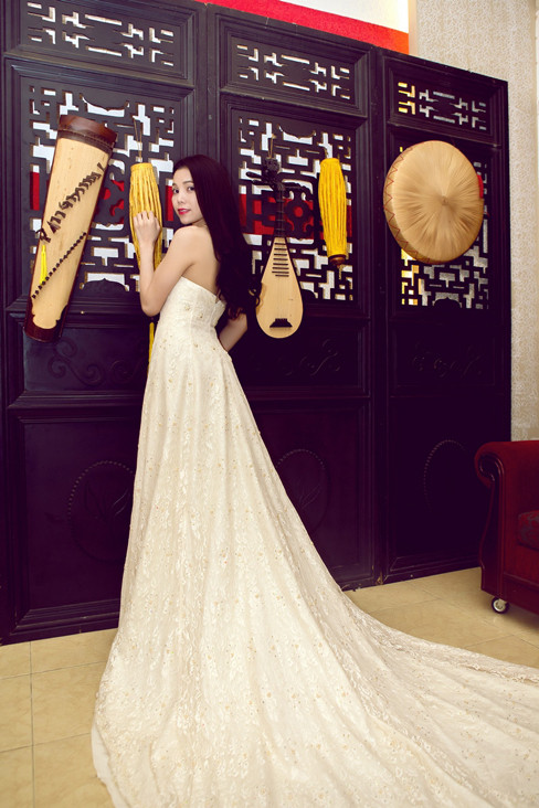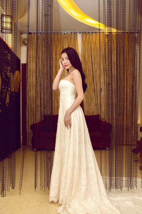 Chính vì vậy mà Trà Ngọc Hằng dù rất thích nhưng không bao giờ chụp ảnh với những chiếc váy cưới xinh xắn. Trong buổi tiệc tối 25/11, người đẹp đã hết lời năn nỉ mẹ để mặc và chụp thử một bộ ảnh trong chiếc váy cưới mà cô khá yêu thích trong tiệm.