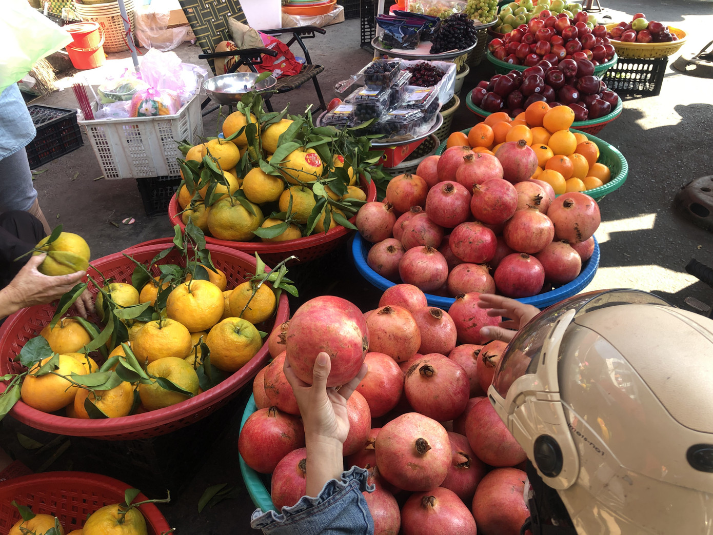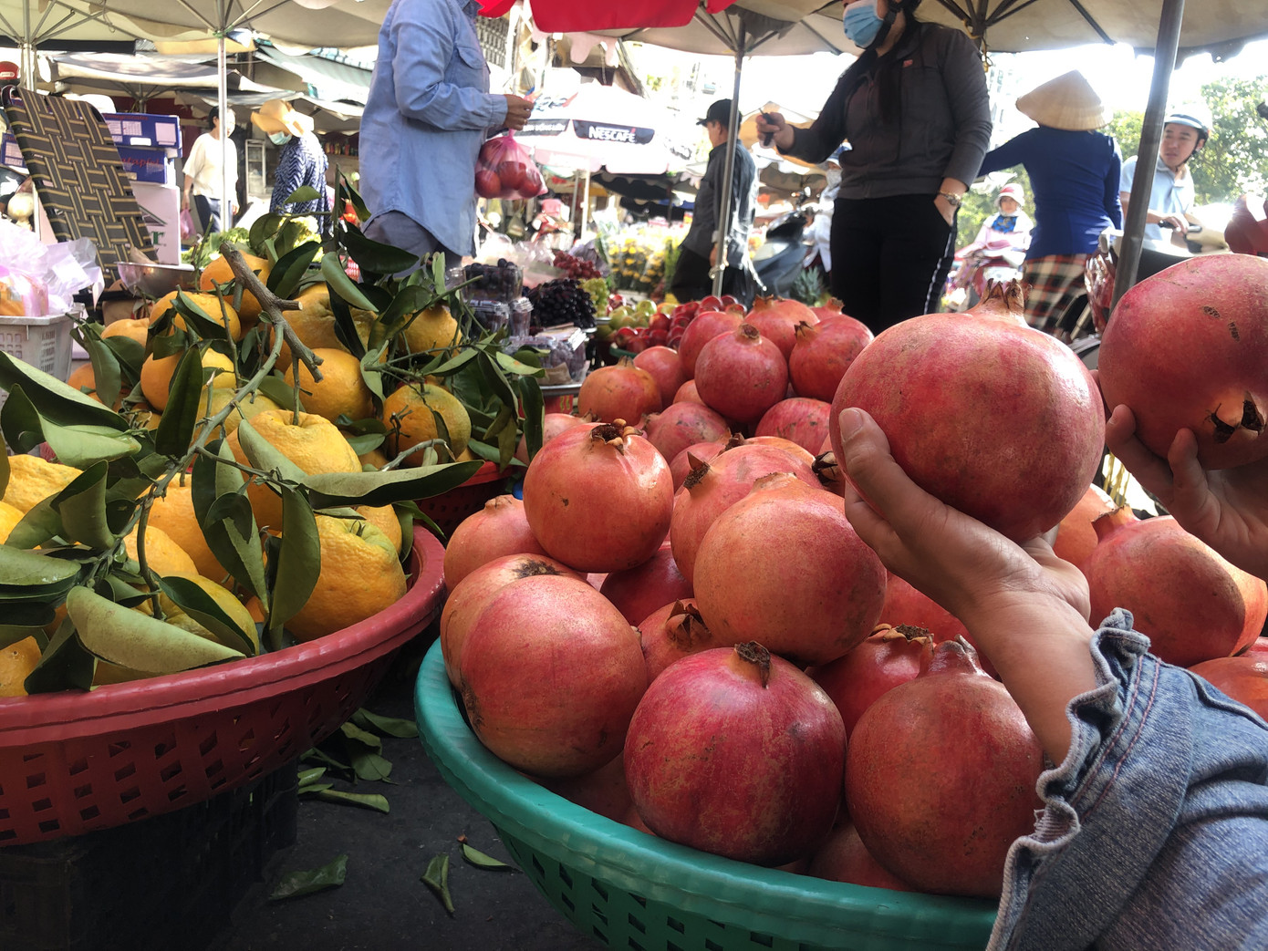 Khu vực bên hông bến xe Chợ Lớn (Q.6), góc đường Phú Hữu, người kinh doanh trải sạp, đặt quầy lấn hết lối đi để bán hàng. Chất đầy mâm trái cây cực to, người phụ nữ trung niên cho biết đây là quýt Hàn còn nguyên cuống lá, lựu Mỹ đều đồng giá 100.000 đồng/kg, với quýt đã gãy cuống thì giảm còn 80.000 đồng/kg.