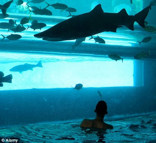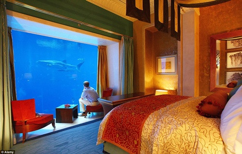 Mức phí cho một đêm tại căn phòng dưới nước ngắm cá mập ở khách sạn Underwater Suites, Dubai không hề rẻ: 8200USD/đêm. Căn phòng hạng sang nằm trong khu thủy cung giúp du khách ngắm nhìn hơn 65.000 sinh vật biển qua lớp kính chịu lực trong suốt.