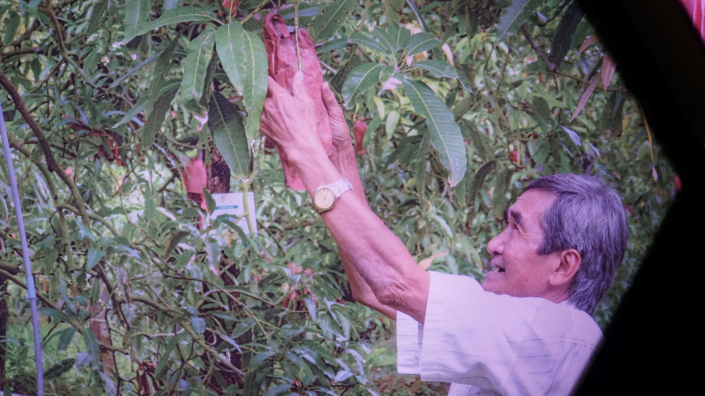 | Hình ảnh nông dân trồng xoài được tái hiện tại không gian thực tế ảo. Ảnh: An Bình |