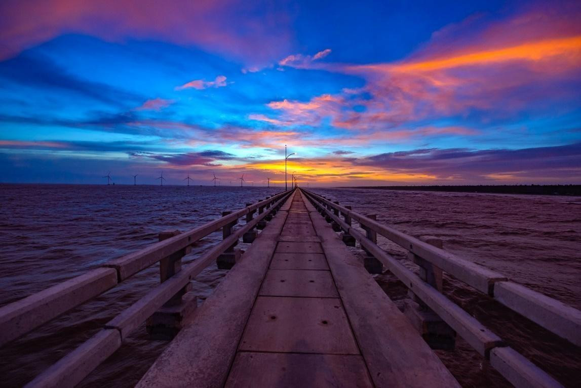 | Cung đường chạy hùng vĩ của giải Marathon Trung Nam – Vượt Trùng Khơi 2022 trên mặt biển với những trụ gió sừng sững hai bên. |