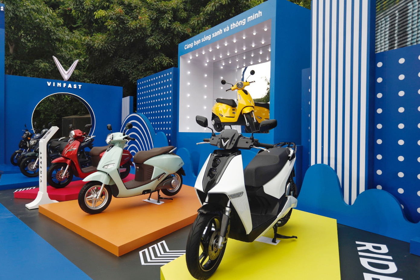 Ngay lối vào là khu vực trưng bày các mẫu xe máy điện và xe đạp điện. Dải sản phẩm xe máy điện của VinFast bao gồm: Ludo, Impes, Evo200, Feliz S, Klara S, Vento S và Theon S. Những mẫu xe này đã khẳng định vị thế trên thị trường, chinh phục khách hàng Việt trên khắp cả nước. Hàng loạt tính năng hiện đại, thông minh đã được tích hợp trên các sản phẩm của VinFast như pin LFP tối ưu quãng đường di chuyển, phanh ABS an toàn hàng đầu, kết nối điện thoại thông minh…