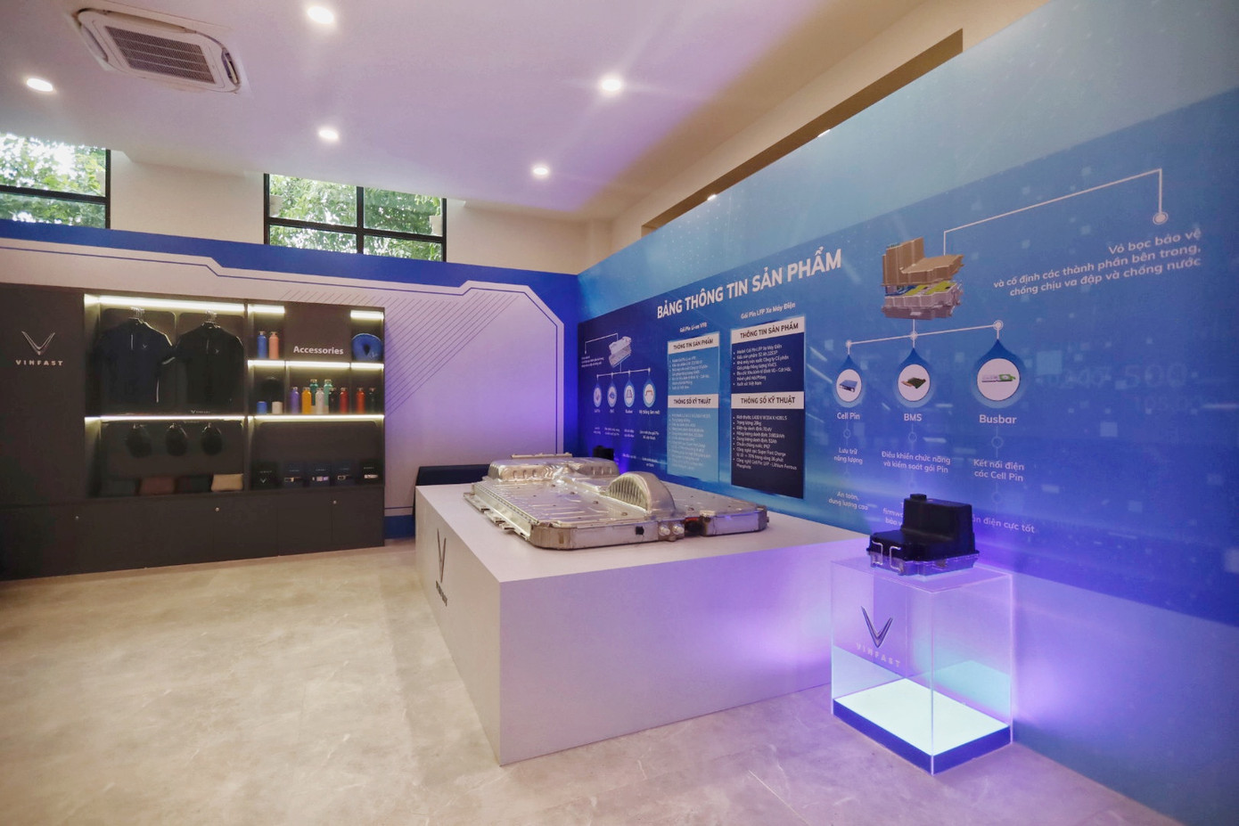 Cuối căn phòng, VinFast giới thiệu công nghệ trợ lý ảo Vivi và trưng bày bộ pin LFP dùng trên ô tô điện, xe máy. Đây giống như một sự khéo léo thể hiện rằng, hành trình 6 năm là một phần của chặng đường hướng đến mục tiêu đưa ra thị trường những mẫu xe thông minh, thân thiện và bền vững. Với đầy đủ sản phẩm xe đạp điện, xe máy điện, ô tô điện và xe buýt điện, VinFast được ví như một thương hiệu cung cấp các giải pháp di chuyển bền vững, thay vì một hãng xe thông thường.