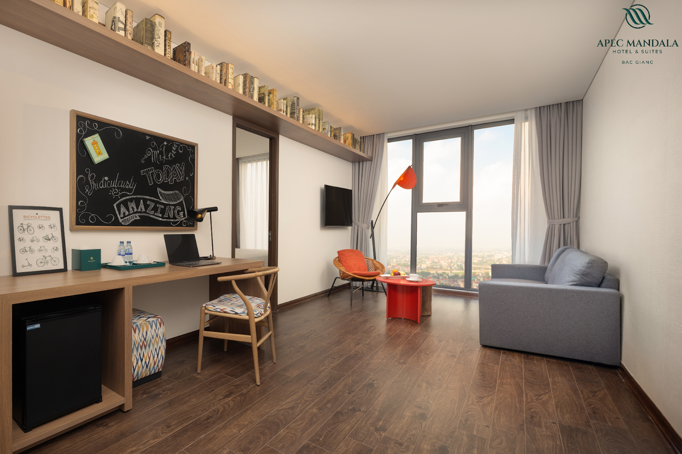 Các hạng phòng tại Apec Mandala Bắc Giang được chia thành Deluxe, Executive, Mandala Suite, 2 BR Suite và 3 BR Suites với diện tích mỗi phòng dao động từ 30m2 cho tới 90m2, đáp ứng nhu cầu đa dạng của mỗi du khách. Đặc biệt, tất cả các phòng đều có bếp nấu và phòng khách riêng biệt, mang đến cho bạn cảm giác gần gũi như đang sống trong chính căn hộ của mình. Theo đó, một không gian yên tĩnh và ấm cúng tại đây sẽ giúp các khách hàng doanh nhân nghỉ ngơi thư giãn, cân bằng lại tinh thần và “sạc” đầy pin năng lượng, sẵn sàng cho một ngày làm việc mới.