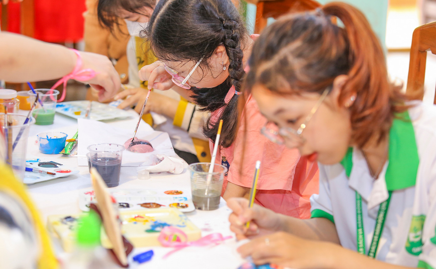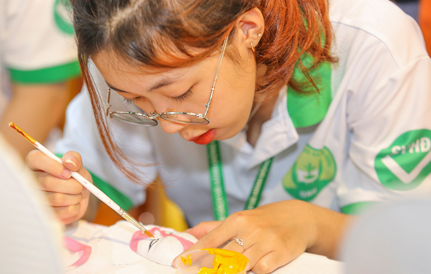 | Thích thú trải nghiệm vẽ mặt nạ hát bội. Ảnh: T.H. |