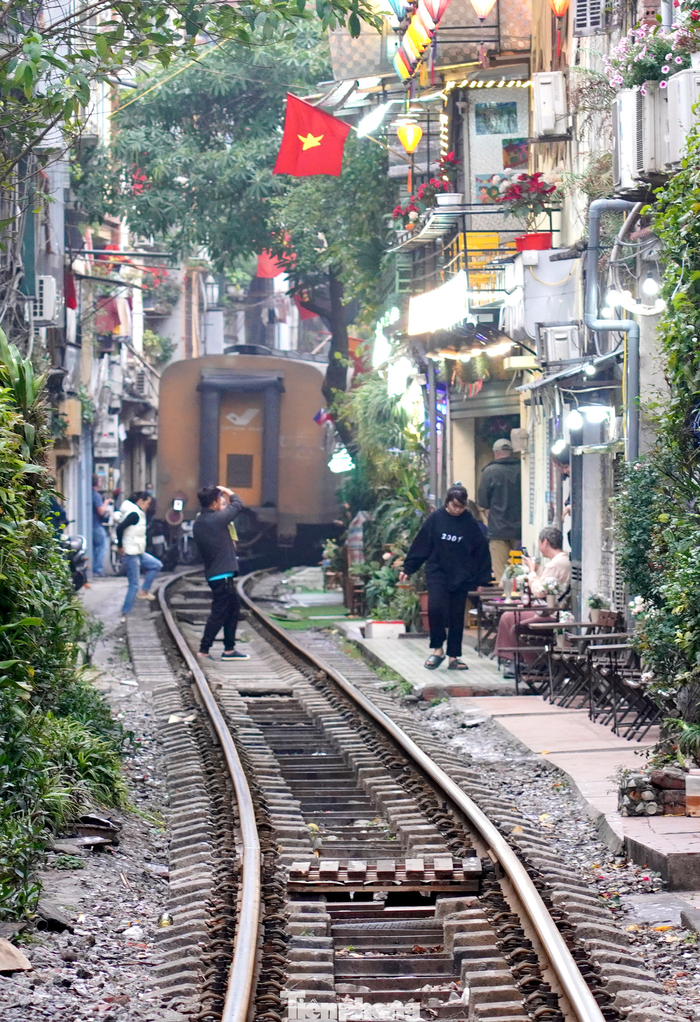 | Trên các đoạn đường ray này hiện có lẻ tẻ khoảng 3,4 hàng cà phê vẫn duy trì khách ngồi ven hành lang tàu chạy qua. Tuy không rầm rộ như những ngày cao điểm nhưng nơi đây vẫn có du khách. |