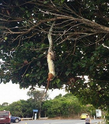 Cảnh tượng trăn thảm dài ít nhất 1,5 mét nuốt trọn thú có túi giữa không trung được Michelle Hunjak ghi lại ở vịnh Byron, bang New South Wales, Australia, Mirror hôm qua đưa tin.