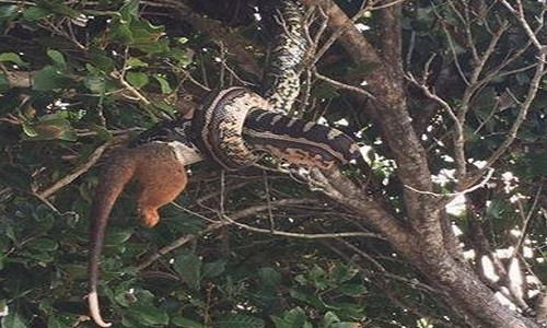 Con trăn mất tới 15 phút để xử lý bữa ăn ở tư thế treo ngược mình trên cành cây.