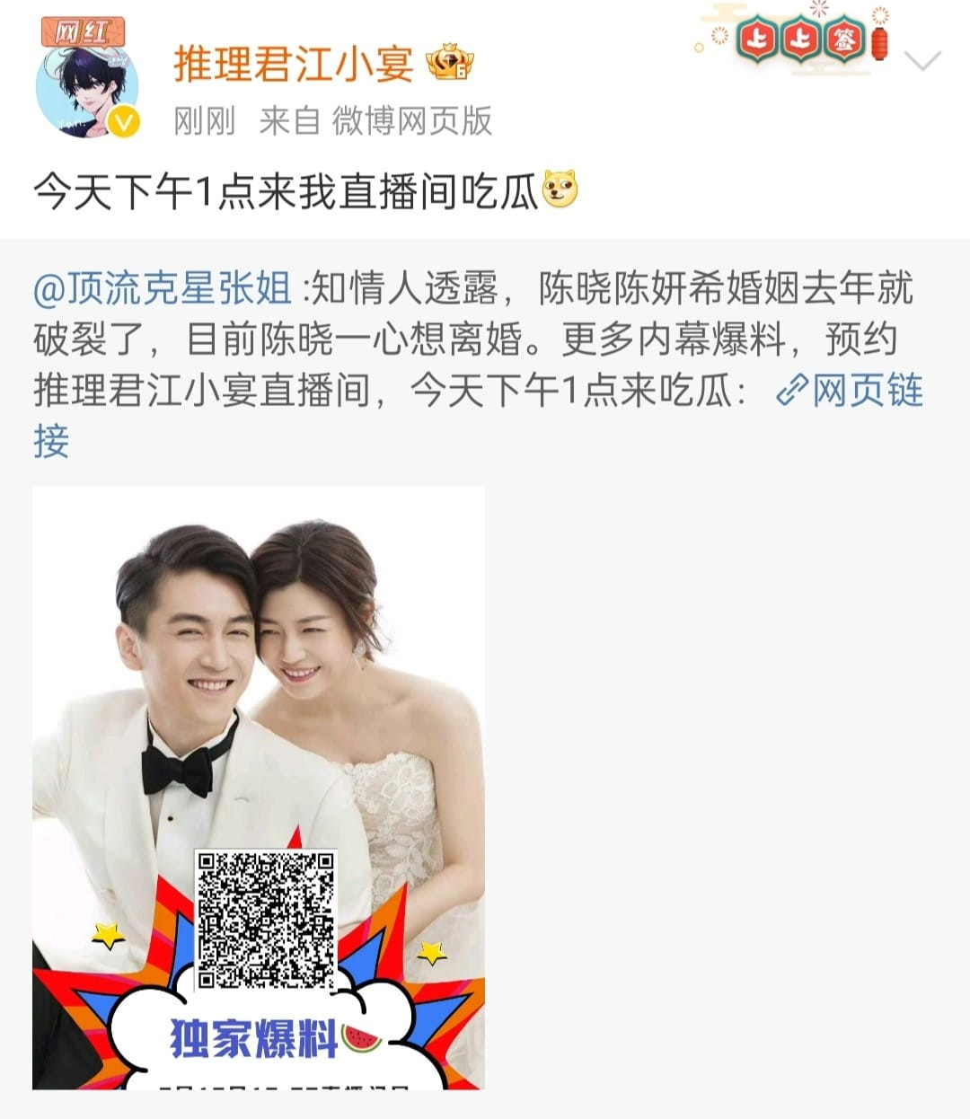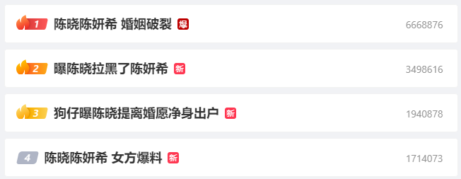 Từ khóa "Trần Hiểu - Trần Nghiên Hy tan vỡ" leo lên đầu bảng Hot Search mục Chung lẫn Giải trí trên Weibo với lượng truy cập nhanh chóng tăng lên hàng triệu. Các hashtag liên quan cũng xếp hàng ở top đầu. Qua khoảng 2 tiếng kể từ khi blogger livestream, tin tức vẫn chưa hạ nhiệt. Hàng loạt hashtag vẫn "treo đỏ" top đầu mà phía cặp đôi vẫn chưa lên tiếng khiến cư dân mạng tin rằng tin tức hôn nhân đổ vỡ của Trần Hiểu và Trần Nghiên Hy là thật. Trước đó, hàng loạt những tin đồn về hôn nhân không hạnh phúc của cả hai bị lan truyền, như Trần Hiểu ngoại tình, Trần Nghiên Hy kiểm soát chồng quá mức... Tất cả đều không xác thực và sớm bị lơ đi.