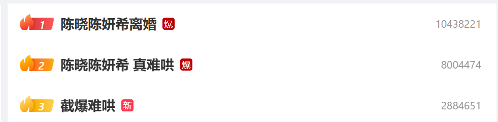 Chiều 18/2, sau khi Trần Hiểu và Trần Nghiên Hy tuyên bố đã "đường ai nấy đi" sau gần 10 năm kết hôn, hashtag về việc ly hôn của hai người lập tức thu hút hàng chục triệu lượt truy cập, dẫn đầu bảng Hot Search cả 2 mục Chung và Giải trí của Weibo.