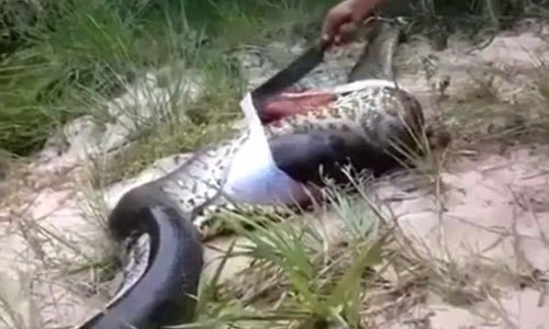 Trong đoạn video đăng tải trên trang Daily Mail, người dân bản địa dùng dao để mổ bụng một con trăn khổng lồ Nam Mỹ nằm chết trên đất. Sau đó, họ phát hiện con trăn chết vì ăn thịt đồng loại.