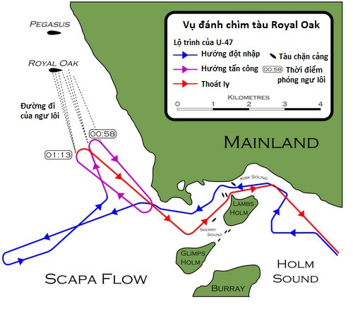 Được sự hỗ trợ của tình báo không ảnh chất lượng cao, U-47 nổi lên và mất 30 phút để phát hiện thiết giáp hạm HMS Royal Oak neo đậu cách đó 4 km về phía bắc. Lúc 0h58, thuyền trưởng Gunther Prien của tàu U-47 ra lệnh phóng ba quả ngư lôi, mở màn trận phục thù của Đức sau thất bại dưới tay hải quân Anh trong Thế chiến I.