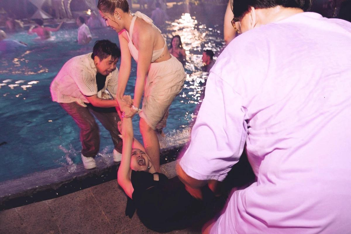 | Sau lễ cưới, các khách mời cùng cô dâu chủ rể nhập tiệc tối và thoải mái trải qua những phút giây vui vẻ. Trấn Thành thậm chí đã cởi bộ vest chỉnh chu, mặc quần đùi, áo ba lỗ nhảy xuống hồ bơi. |