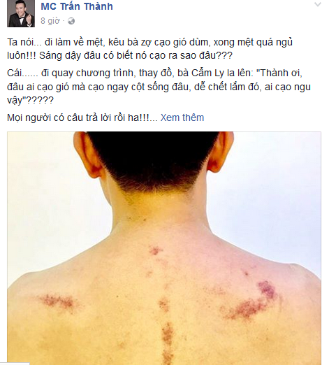 Trấn Thành kể: “Ta nói... đi làm về mệt, kêu bà vợ cạo gió dùm, xong mệt quá ngủ luôn! Sáng dậy đâu có biết nó cạo ra sao đâu? Cái...... đi quay chương trình, thay đồ, bà Cẩm Ly la lên: "Thành ơi, đâu ai cạo gió mà cạo ngay cột sống đâu, dễ chết lắm đó, ai cạo ngu vậy?”. Mọi người có câu trả lời rồi ha! Chèn ơi, nó cạo cái cột sống của tui như cái cột sóng điện thoại tui không nói. Hai bên kia, thường người ta cạo xuống theo hình dấu huyền. Không! Nó thích dấu sắc, cạo đá lên được hông?