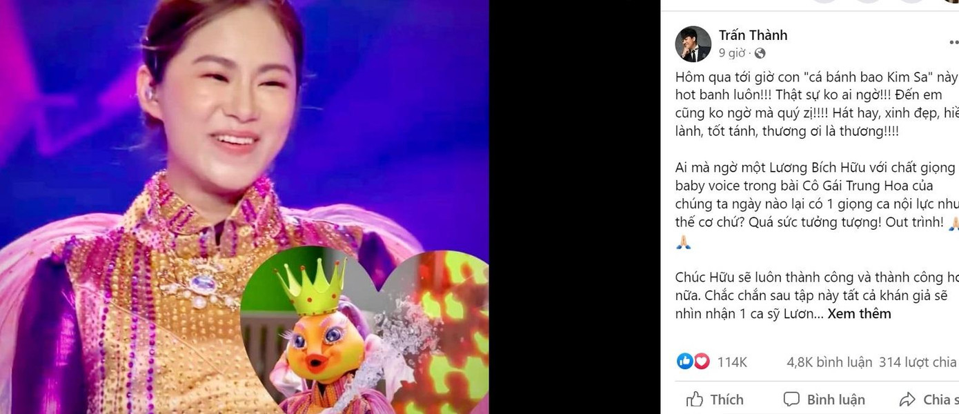 Trấn Thành cũng là một trong những “fan cứng” của Lương Bích Hữu, khi viết trên trang cá nhân: “Ai mà ngờ một Lương Bích Hữu với chất giọng baby voice trong bài Cô gái Trung Hoa của chúng ta ngày nào lại có một giọng ca nội lực như thế cơ chứ? Quá sức tưởng tượng! Out trình! Chúc Hữu sẽ luôn thành công và thành công hơn nữa. Chắc chắn sau tập này tất cả khán giả sẽ nhìn nhận một ca sĩ Lương Bích Hữu với giọng hát nội lực và điêu luyện, chứ không chỉ là một ca sỹ idol của tuổi teen. Hãy luôn sống bình an, hạnh phúc và thăng hoa trong âm nhạc nhé! Chạy show mệt nghỉ nhé! Hữu vẫn còn hát hay lắm lắm đó! Mãi yêu!”.