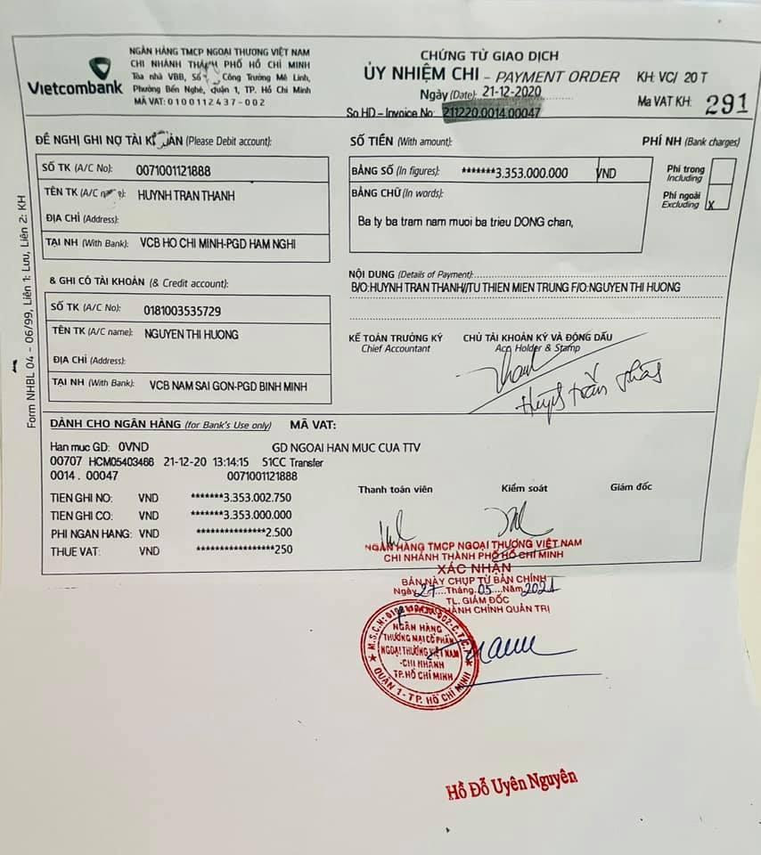 | Uỷ nhiệm chi và sao kê ngân hàng chứng minh Trấn Thành đã chuyển hơn 6 tỉ cho đồng cho mẹ Hồ Ngọc Hà. |