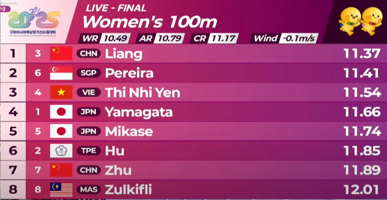 Kết quả, Xiaojing giành huy chương Vàng với 11,37 giây, Periera giành huy chương Bạc với 11,41 giây còn Nhi Yến đoạt huy chương Đồng với thành tích 11,54 giây. Đây chưa phải thành tích tốt nhất của VĐV người Long An, bởi cô từng hoàn thành cự ly 100m với 11,40 giây, đạt kỷ lục trẻ quốc gia và giành huy chương Bạc U20 châu Á 2024.
