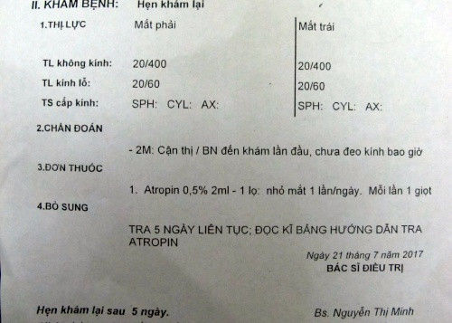 Theo bác sĩ Minh, bệnh nhân mỏi mắt, thị lực chỉnh kính không đạt tối đa nên đã ghi đơn thuốc, hẹn khám lại sau 5 ngày để xác định độ cận thị chính xác. Trên tờ phiếu khám của bé có ghi chi tiết về kết quả khúc xạ. Khi người nhà bệnh nhân yêu cầu khám lại, bác sĩ đã chuyển bé đi hội chẩn cấp cao hơn về chuyên môn tại phòng khám mắt trẻ em. Kết quả hội chẩn với lãnh đạo khoa Mắt trẻ em sau đó và kết quả khám lại vào ngày 3/8 của một bác sĩ khác, đều không khác với chẩn đoán ban đầu của bác sĩ Minh.