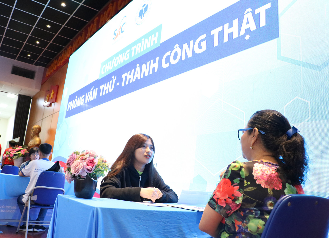 Đại diện các doanh nghiệp phỏng vấn sinh viên tại ngày hội. Đến với ngày hội, nhiều đơn vị tham gia tuyển dụng giới thiệu, tư vấn cách thức chuẩn bị hồ sơ và tổ chức tuyển dụng sinh viên và sinh viên đã tốt nghiệp ứng tuyển vào các vị trí việc làm của công ty.
